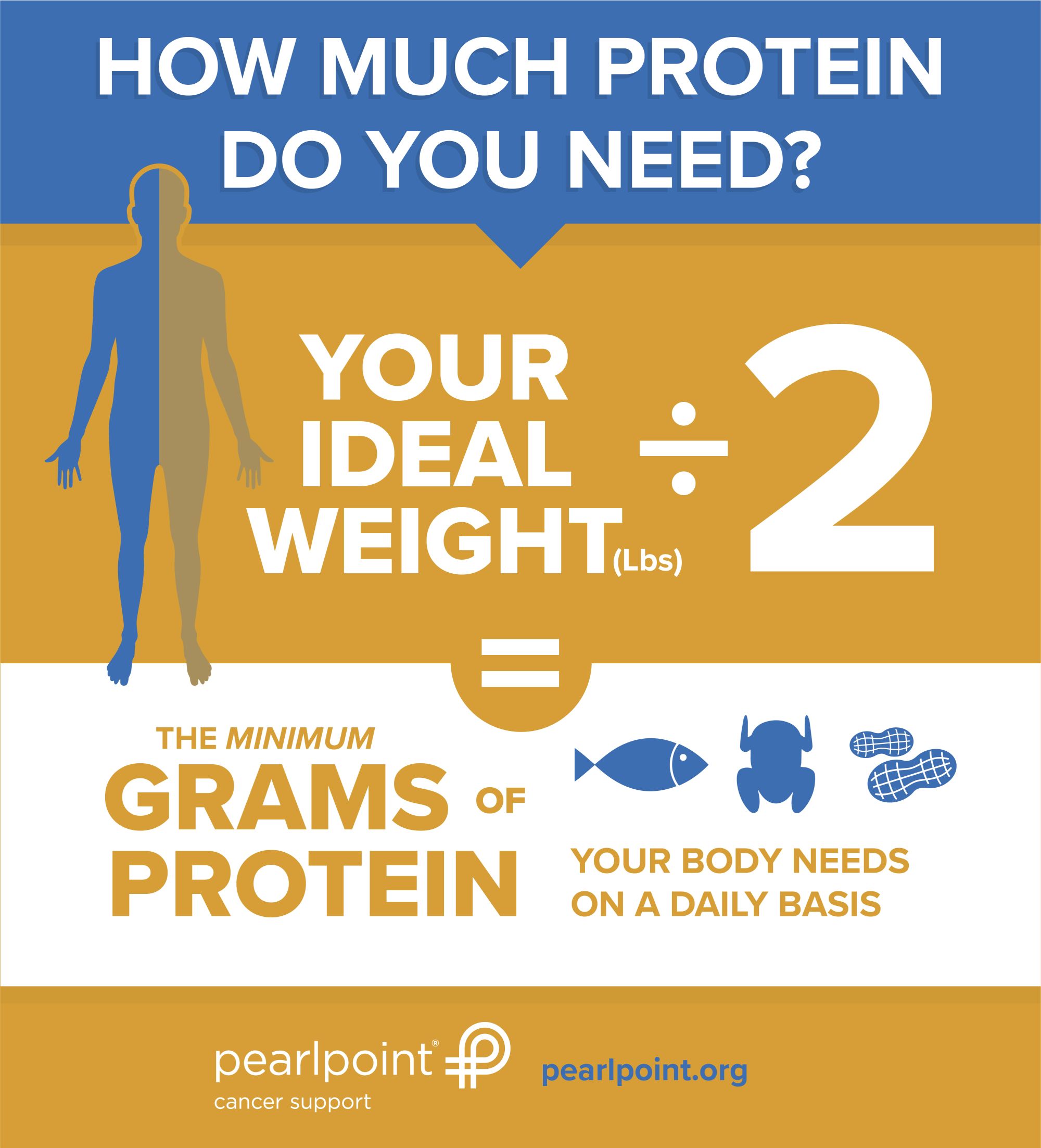The result of dividing your ideal weight in pounds by 2 is the minimum number of grams of protein your body needs on a daily basis. This is about 1 gram of protein per kilogram of body weight (1kg = 2.2 pounds). The protein requirement could reach 2.5 grams per kilogram of body weight if the body is experiencing extreme muscle wasting as a result of cancer or cancer treatment. A registered dietitian can assess protein status and determine individual protein requirements.